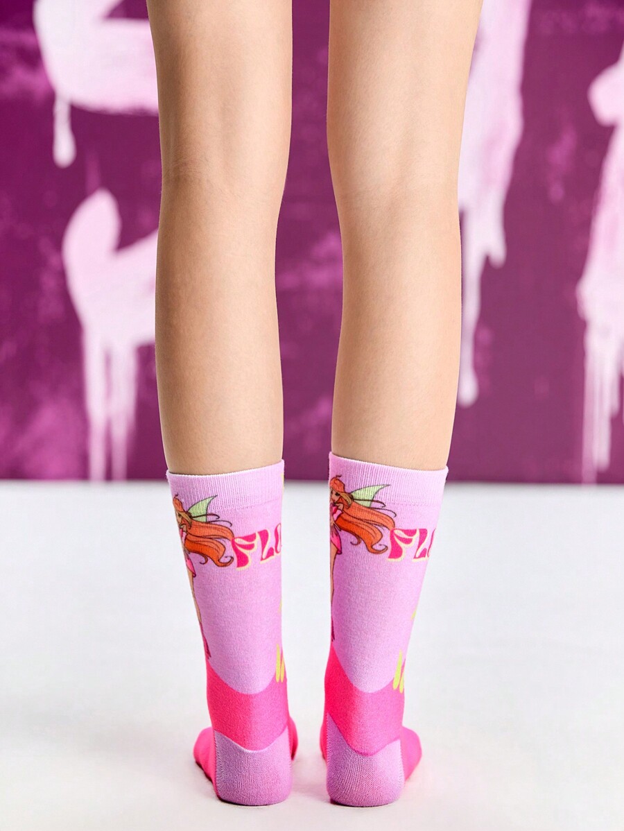 Winx Club X ROMWE 2 Pairs Fashion Colorblock Letter Pattern Mid-Calf Socks For Women, Pink & Purple