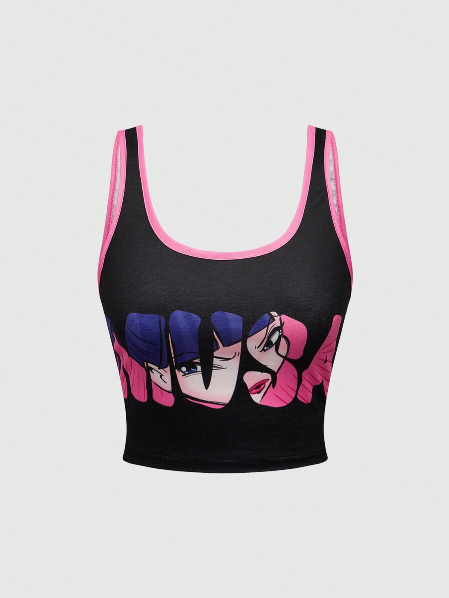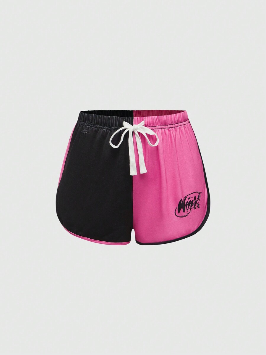 Winx Club X ROMWE Women Casual Cartoon Character Letter Print Ringer Tank Top And Drawstring Waist Contrast Color Loose Shorts Pajamas Set, Summer