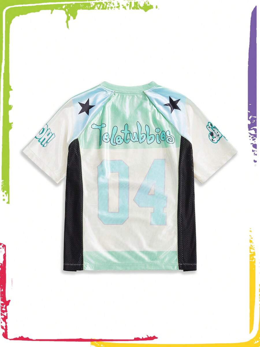 Teletubbies X ROMWE Women's Casual Colorblock V-Neck Dipsy Pattern Loose T-Shirt Top, Summer