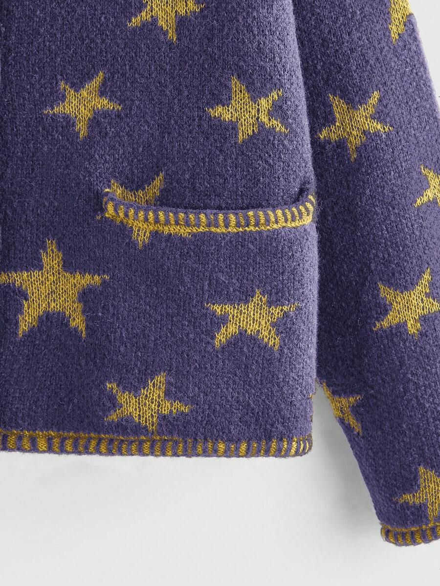 Hippie Women's Casual Pentagram Pattern Drop Shoulder Long Sleeve Knit Cardigan, Autumn/Winter