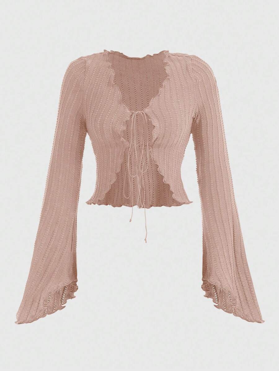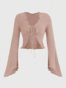 Hippie Women's Casual Solid Color Tie Front Flare Sleeve Blouse