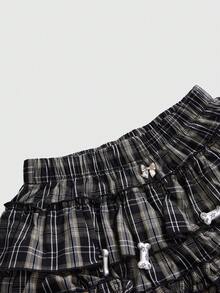 J-Fashion Women's Cute Plaid Bone Cross Decorated Cake Skirt Pants With Bow Decor