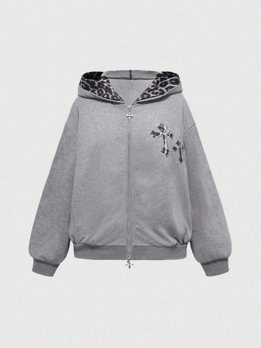 Goth Women's Dropped Shoulder Long Sleeve Casual Cross & Leopard Print Patchwork Hoodie Sweatshirt