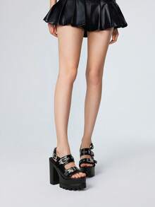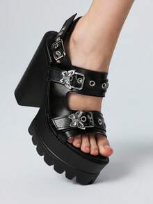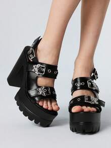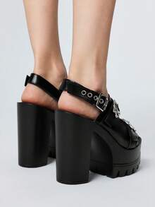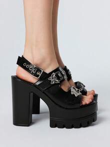 Grunge Punk Women's Fashion Elegant High Heels, Black Round Toe Chunky Heel Punk Goth Style Roman Sandals, Suitable For Parties, Daily Wear, Formal Occasions, Adds Height & Elongates Legs, Comfortable & Versatile