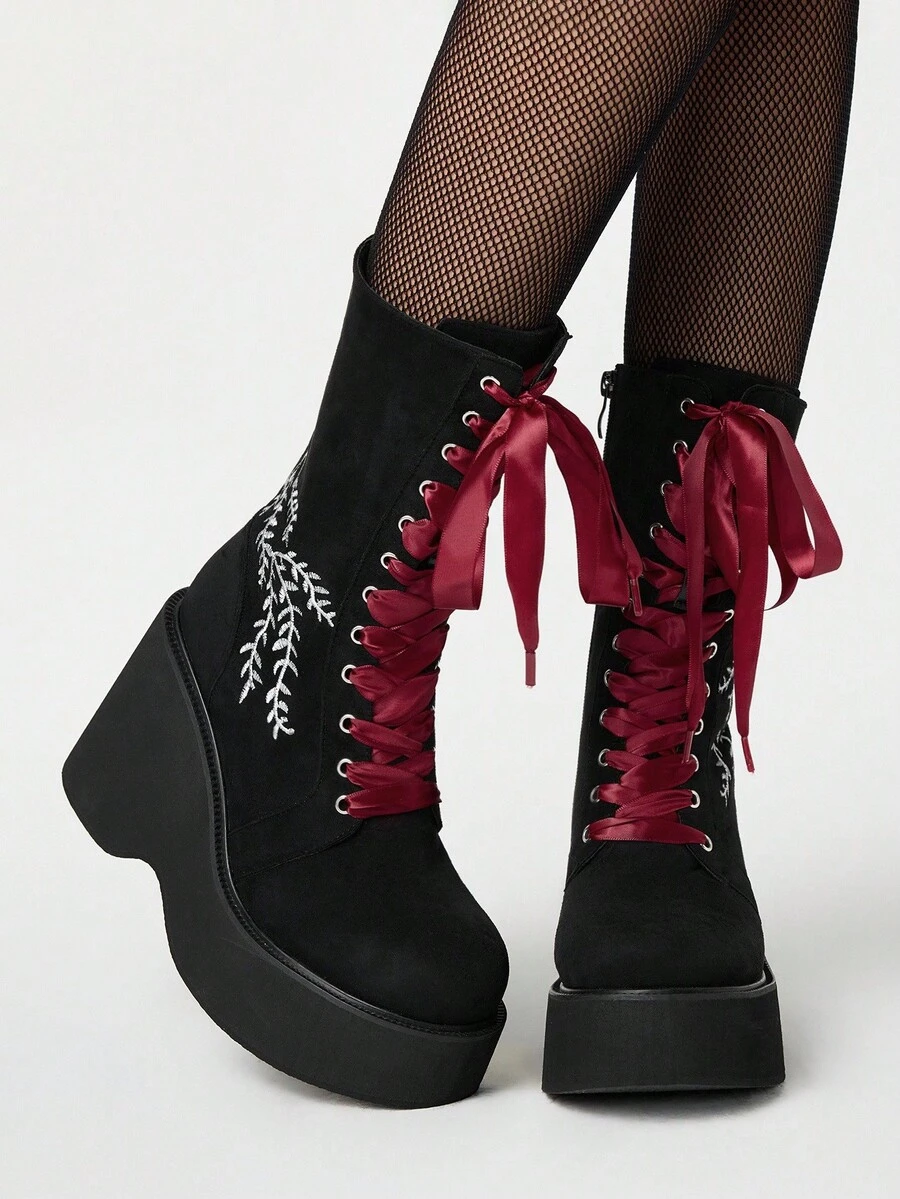 Grunge Punk Women's Fashion Solid Color Suede Platform Mid-Calf Boots, Autumn/Winter Punk Gothic Style White Embroidery Pattern Lace-Up Side Zipper Round Toe Elastic Comfortable High Heel Knight Boots
