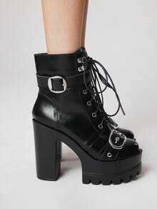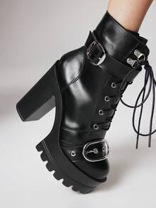 Grunge Punk Women's Gothic Metal Buckle Round Toe Platform Chunky Heel Punk Boots, PU Leather Black High Heel Boots Suitable For Party, Daily Wear, Evening Dress, Height Increasing And Leg Lengthening