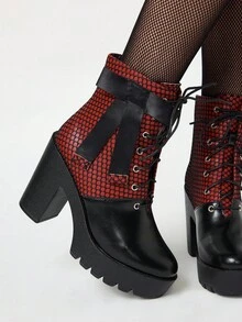 Grunge Punk Women's Gothic Round Toe Chunky Heel Platform Punk Boots, Suede & PU Leather Splice, Black High Heel Boots Suitable For Party, Daily Wear, Evening Dress, Height Increasing And Leg Lengthening