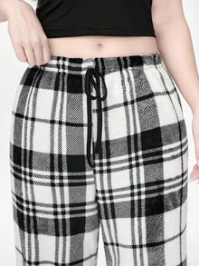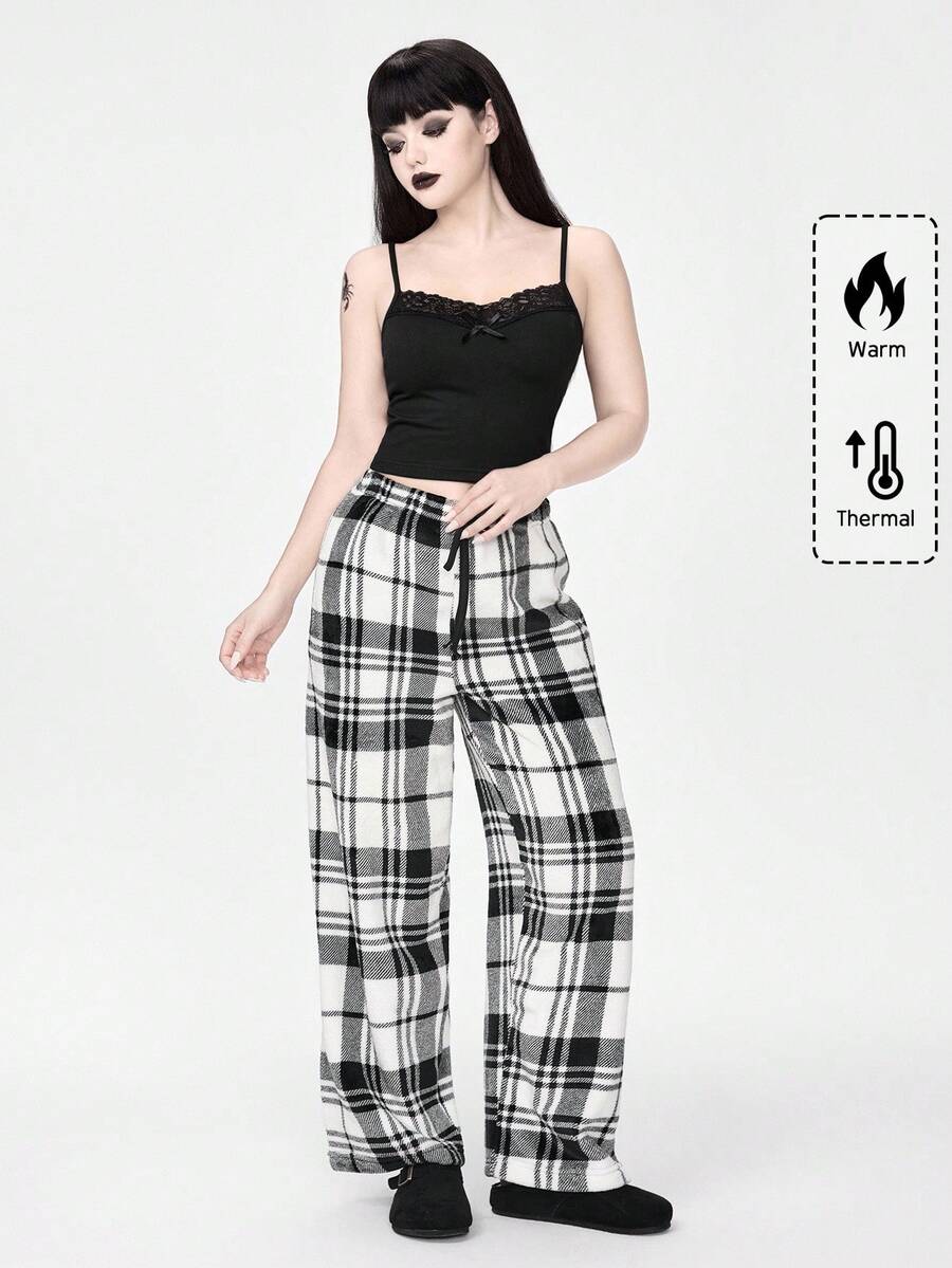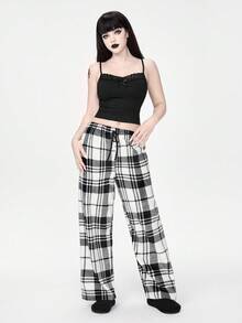 Goth Women's Gothic Solid Color Lace Camisole Top & Plaid Flannel Pants Casual Pajama Set, Winter Clothes