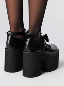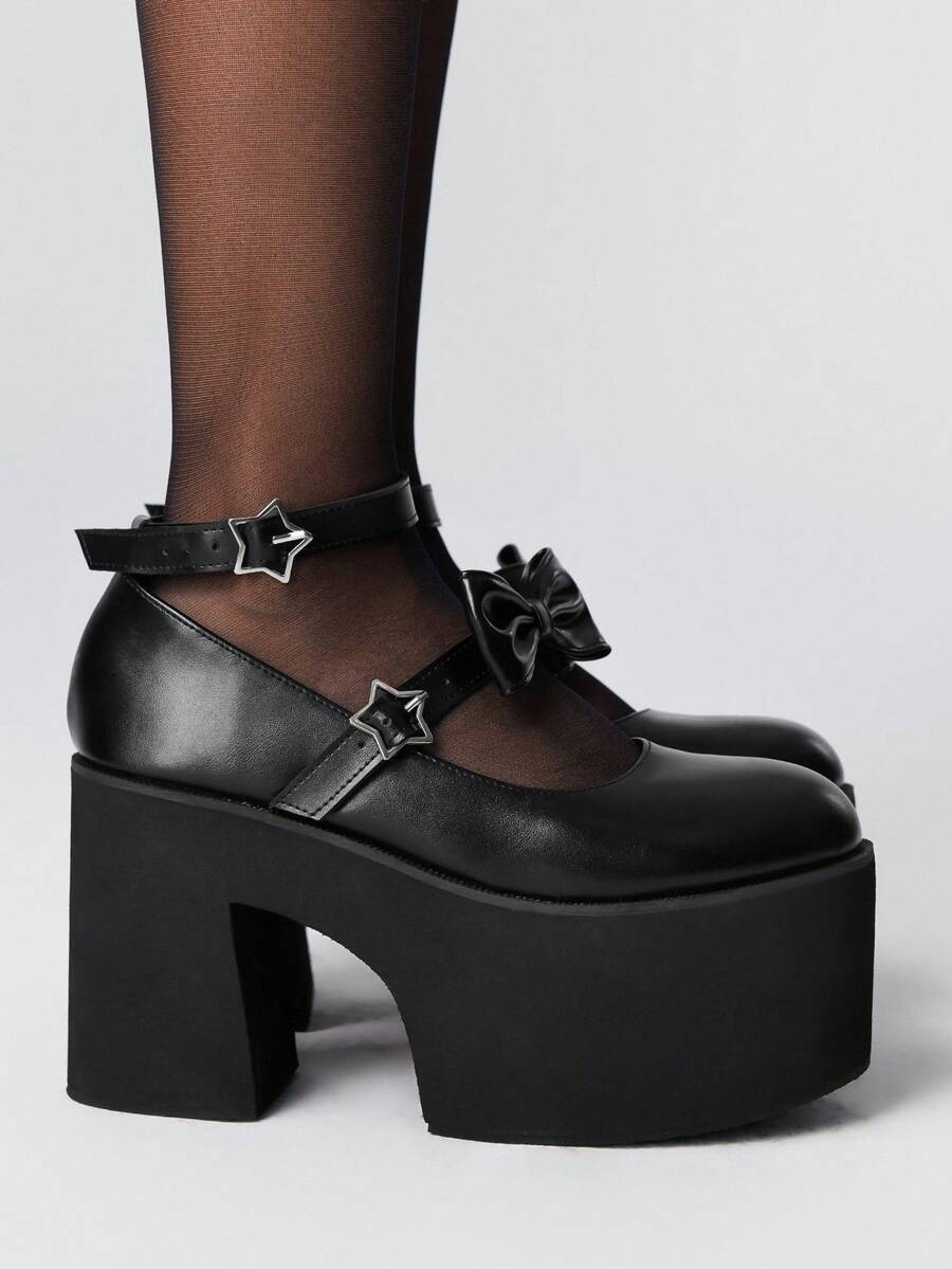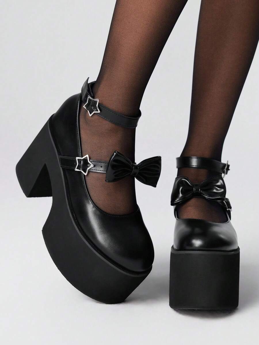 Grunge Punk Women's High Heel Mary Jane Pumps, Punk Style With Rivet, Metal Buckle & Bow Design, Black Platform Heels Suitable For Party, Daily Wear, Evening Dress, Height Increasing And Leg Lengthening, Comfortable And Versatile