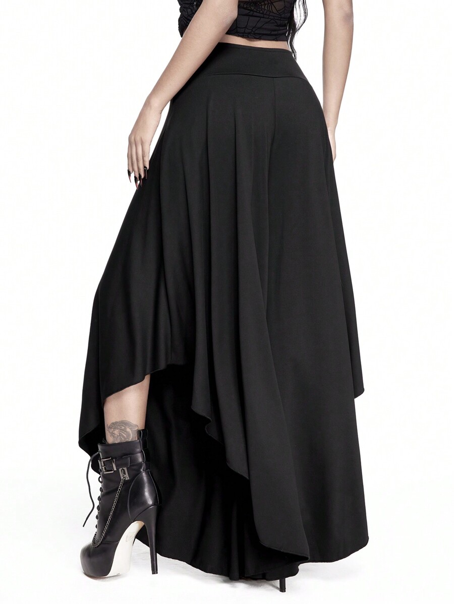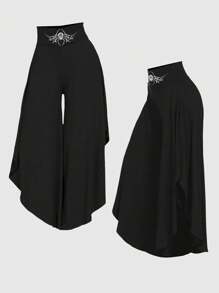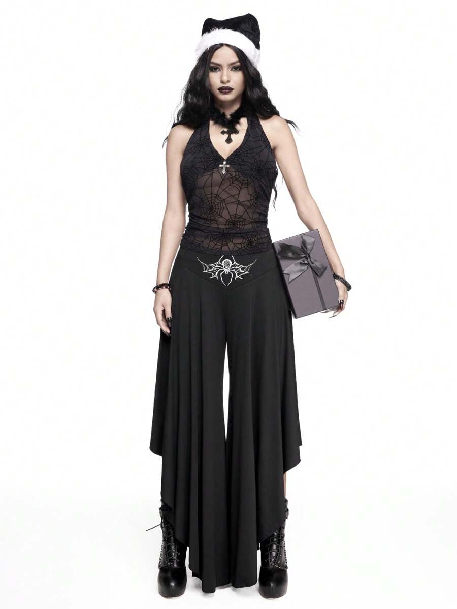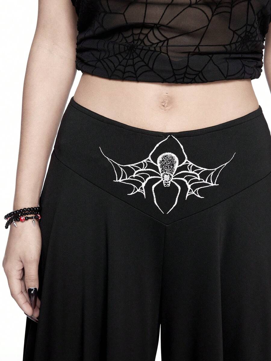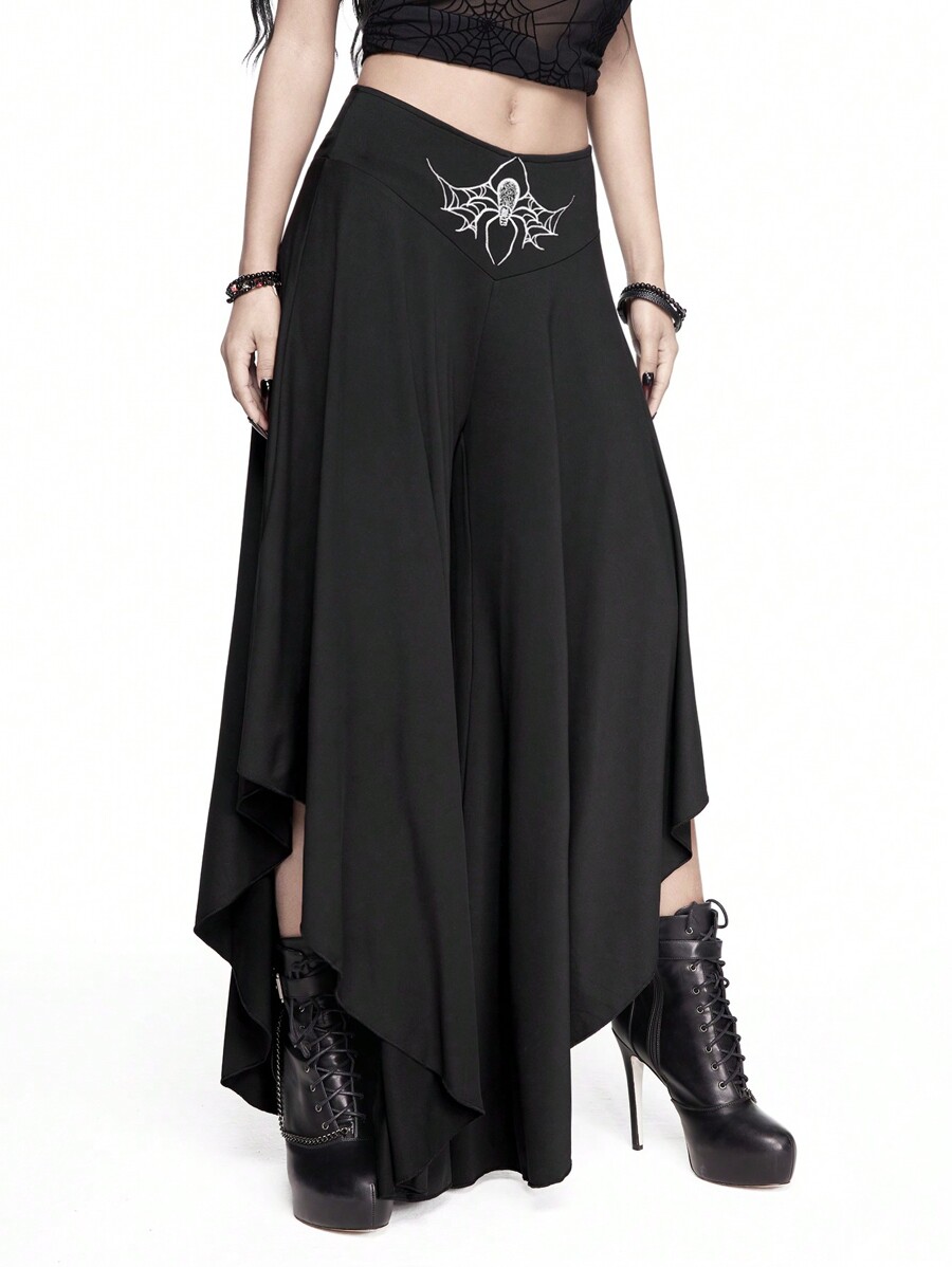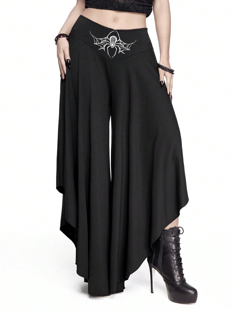 Women's High Waist Gothic Style Spider Embroidery Asymmetric Wide Leg Pants, Solid Color