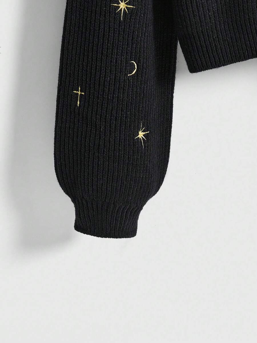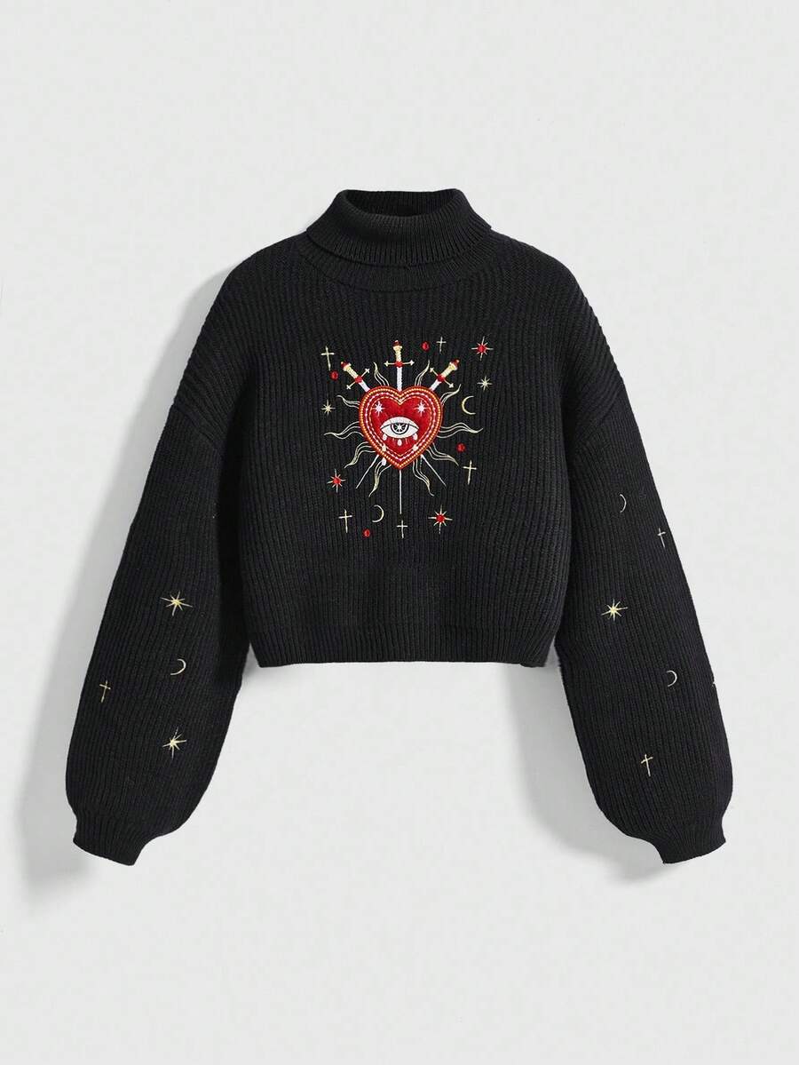Goth Women's Mock Neck Patterned Embroidery Lantern Sleeve Cropped Pullover Sweater