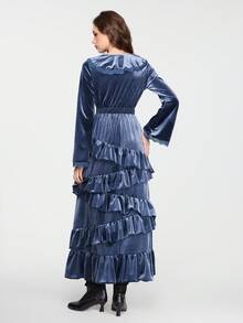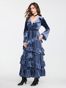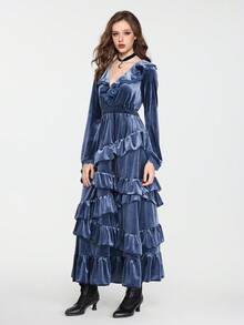 EDITION Women's Mysterious Dark Night Witch Style Vintage Lace Patchwork Ruffle Hem Deep V Sexy Extra Long Dress
