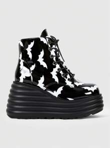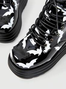 Grunge Punk Women's Platform Lace-Up Casual Bat Print Ankle Boots & Short Boots, Versatile, Halloween