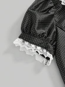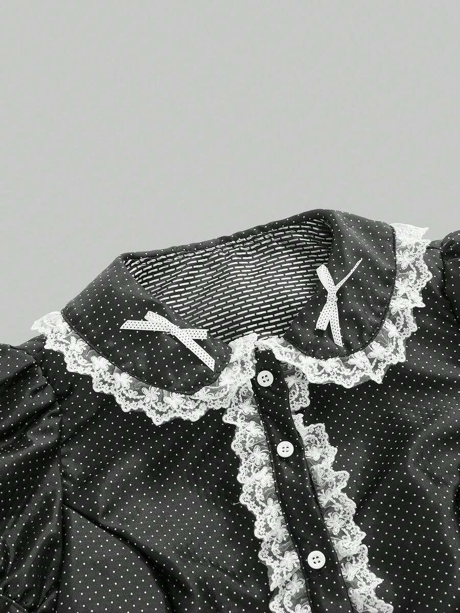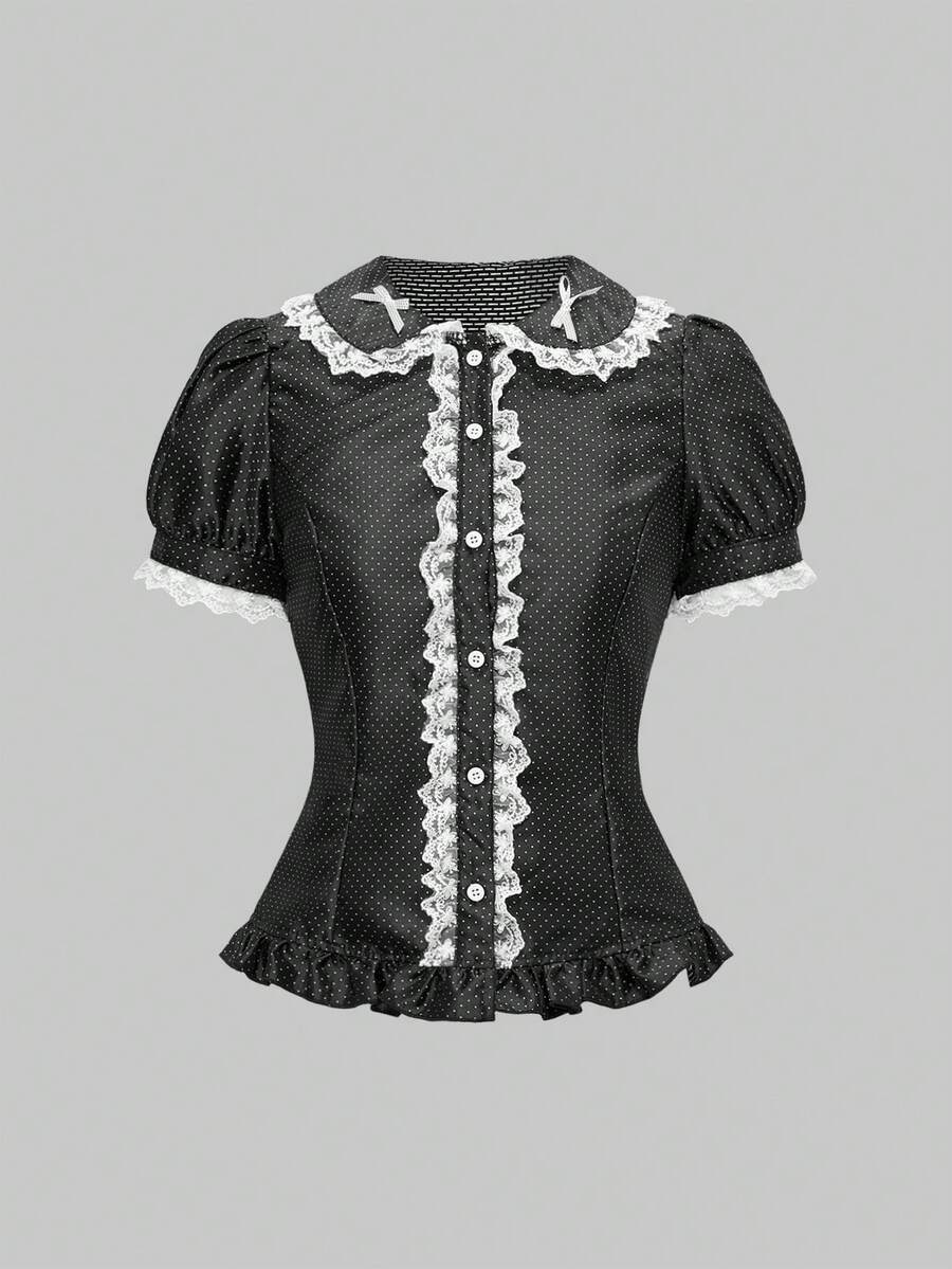 Kawaii Women's Polka Dot Fitted Waist Lace Patchwork Short Sleeve Blouse