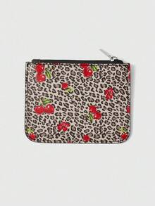 Grunge Punk Women's Portable Card Holder Vintage All-Over Leopard & Cherry Print Coin Purse