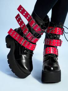 Grunge Punk Women's Punk Style Thick Sole Chunky Heel Ankle Boots, Gothic Metal Red Buckle Decor Platform Wedge Boots, Comfortable For Nightclub Party