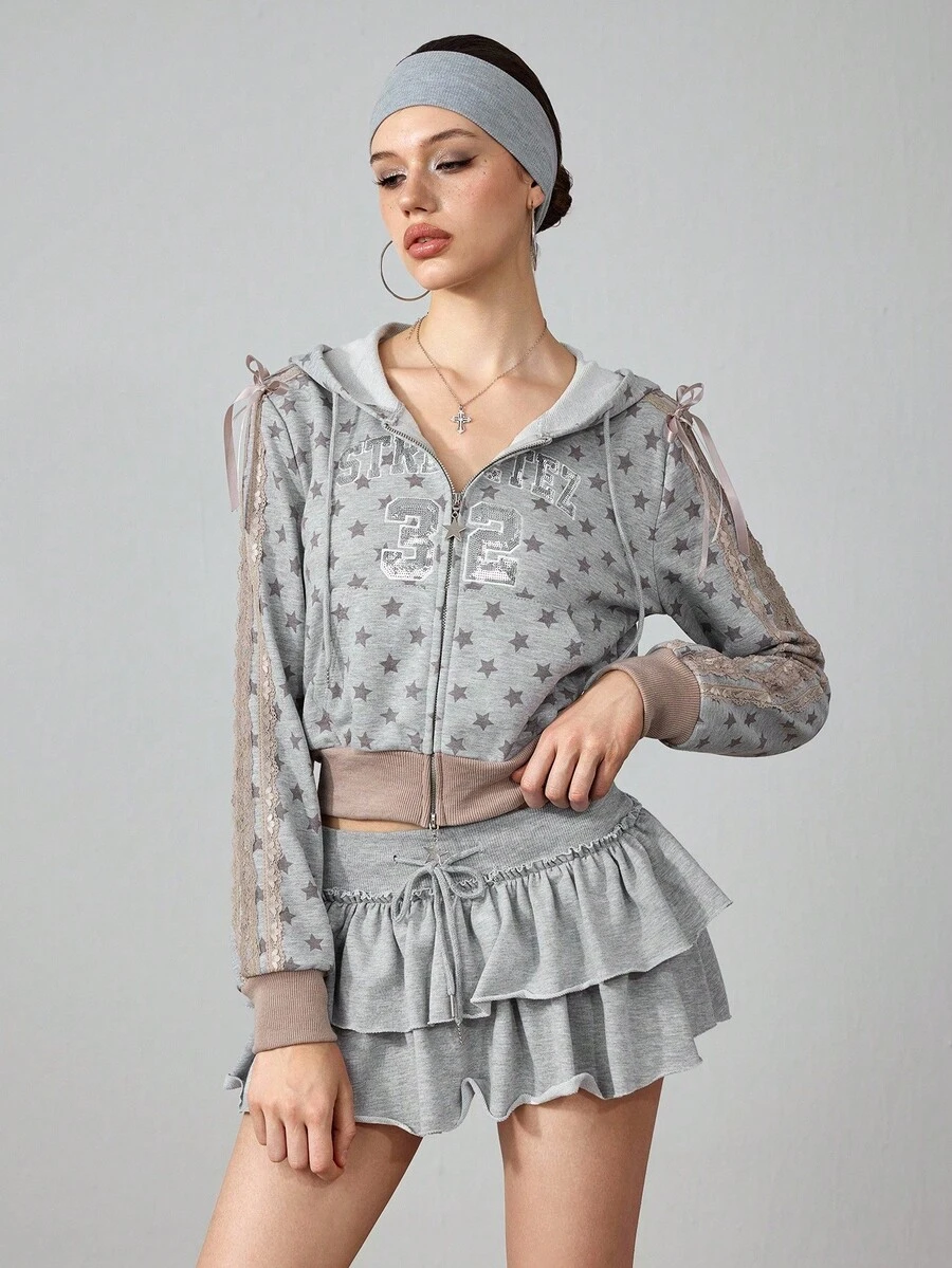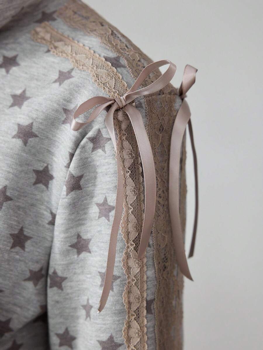 ROMWE Avant Women's Retro Back To School Collegiate Style Star Print Sequin Embroidery Lace Trim Contrast Color Cropped Fitted Sweatshirt