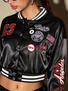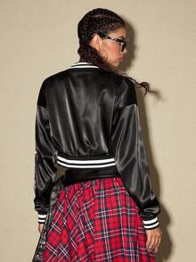 ROMWE Avant Women's Retro College Style Back To School Motorcycle Number & Letter Print Badge Decor Cropped Fitted Basic Satin Jacket