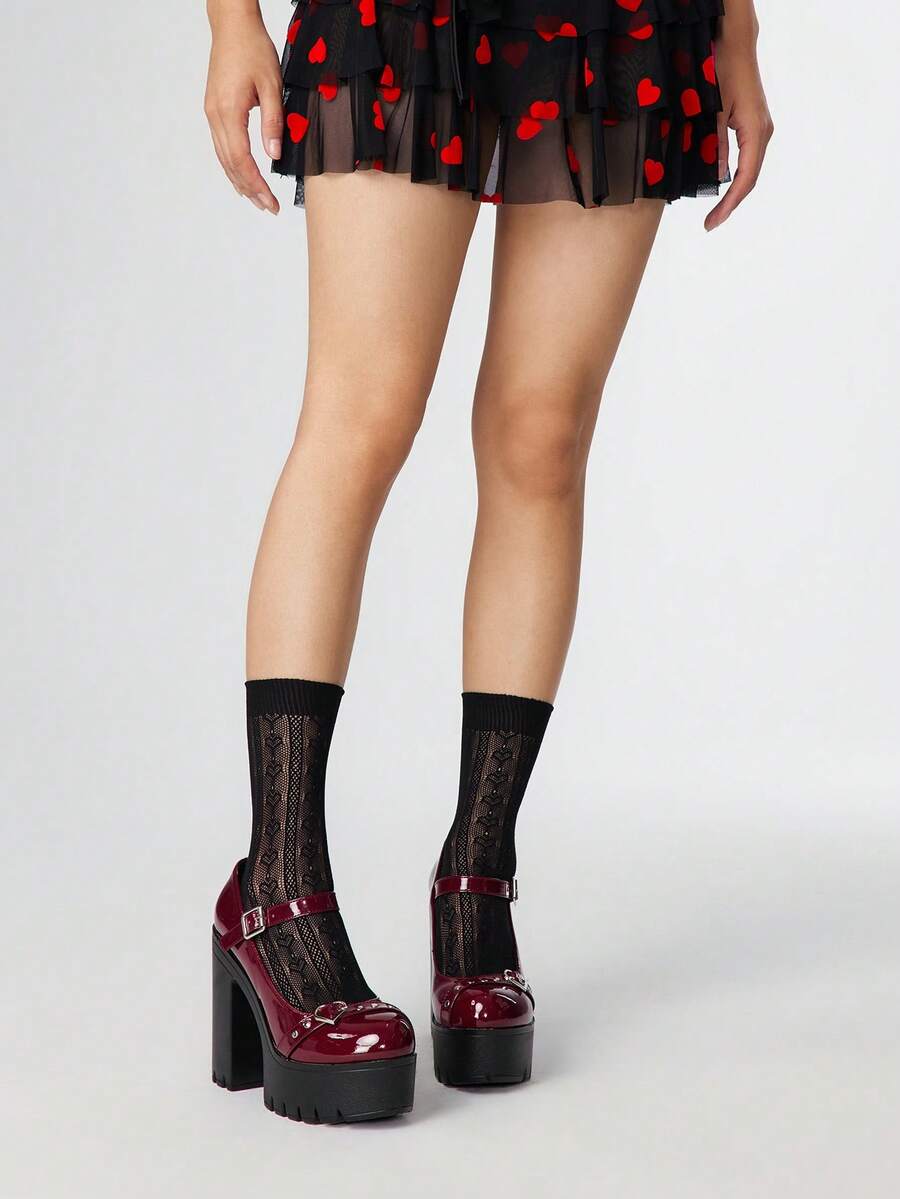 Women's Sexy Burgundy Studded Double Strap Platform High Heel Pumps, Spring/Autumn Fashion Closed Toe Studded Heart-Shaped Buckle Pumps, Nightclub Party Thick Waterproof Platform Chunky Heel Mary Jane Shoes