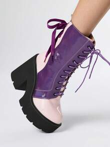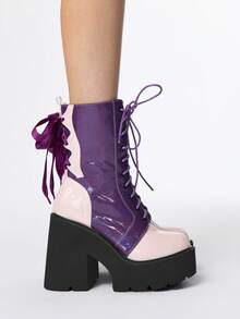 Women's Sexy Fashion Color Block Chunky Heel Mid-Calf Boots, Cute Purple Lace Bow Decor, Platform High Heel Waterproof Gothic Punk Style Lace-Up Side Zipper Motorcycle Boots