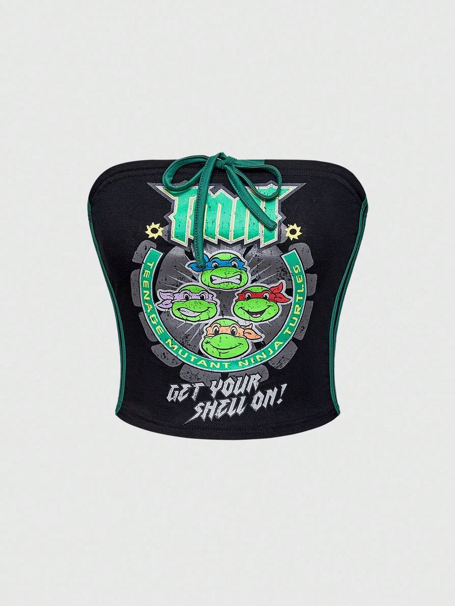 TEENAGE MUTANT NINJA TURTLES X ROMWE Women's Sexy Punk Cartoon Turtle & Slogan Print Contrast Color Bow Decor Fitted Cropped Tube Top, Summer