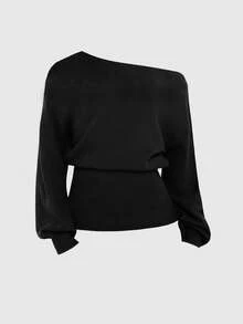 Goth Women's Solid Color Drop Shoulder Long Sleeve Casual Loose Oblique Shoulder Pullover Sweater, Autumn/Winter