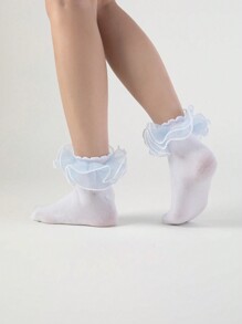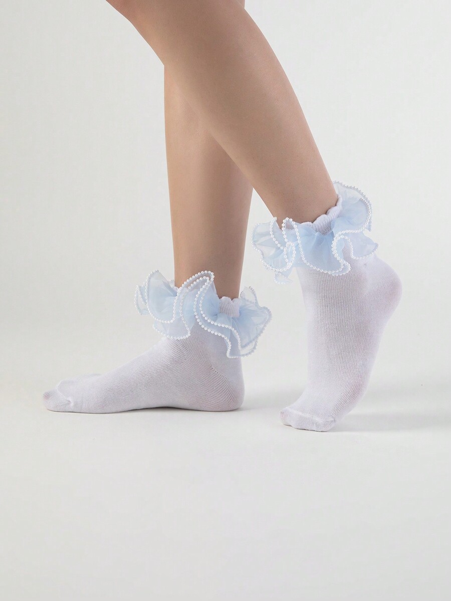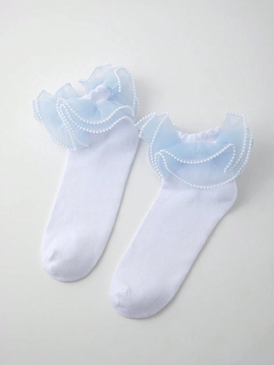 Kawaii Women's Sweet Pearl Embellished Ruffle Trim Crew Socks