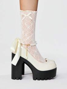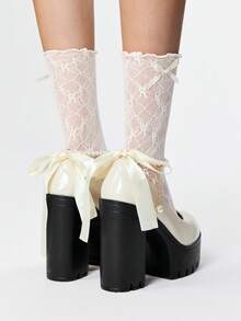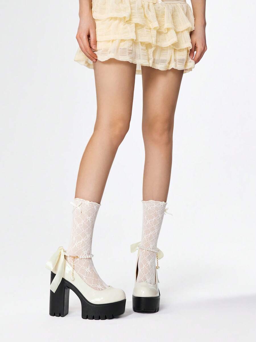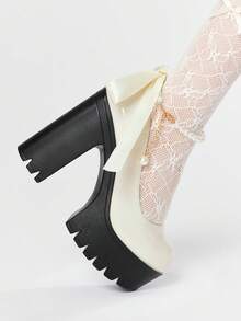 Goth Women's Thick Sole Chunky Heel Pumps, Fashion Solid Color Pearl Buckle Lace Bow Decor High Heel Mary Jane Shoes, Suitable For Party, Outing, Date