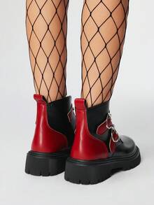 Grunge Punk Women Black & Red Splice Round Toe Boots, Platform 5cm, Goth Punk Metal Studded Heart Buckle Double Strap Design, Fashion Casual Short Booties, PU Leather, College Style