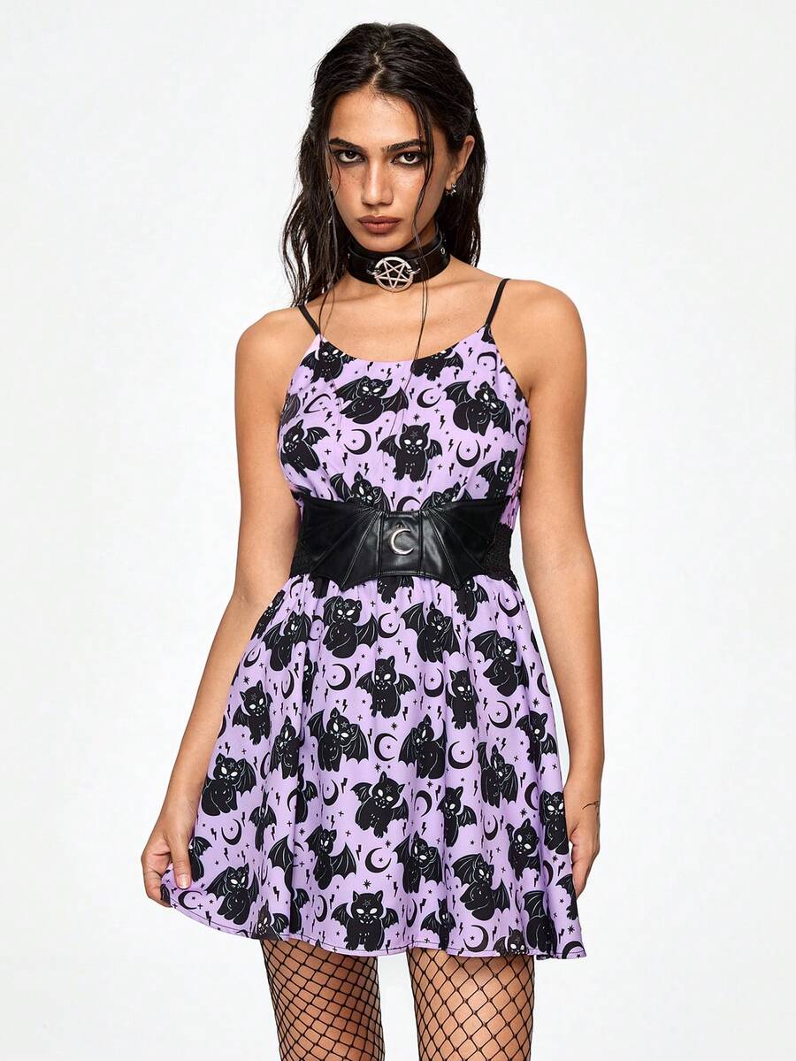 Women Black Cat Print Kawaii Cute Faux Leather Waist Tie Shirt Dress