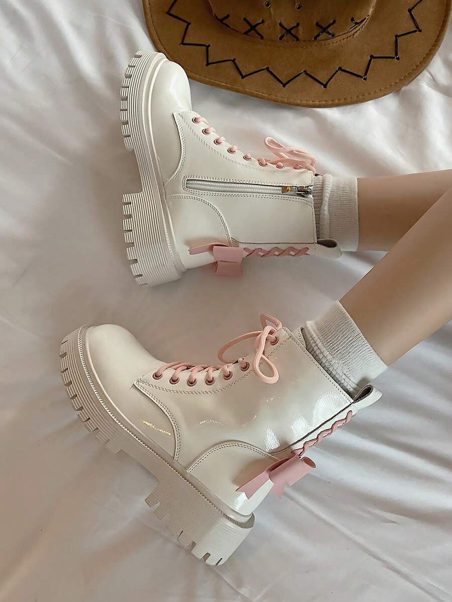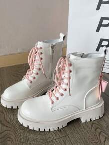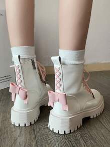 Anime Women Bow Decor Lace-up Front Zipper Side Combat Boots, Cool Outdoor Fashion Boots