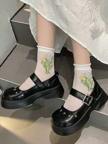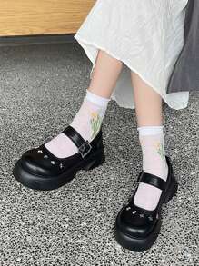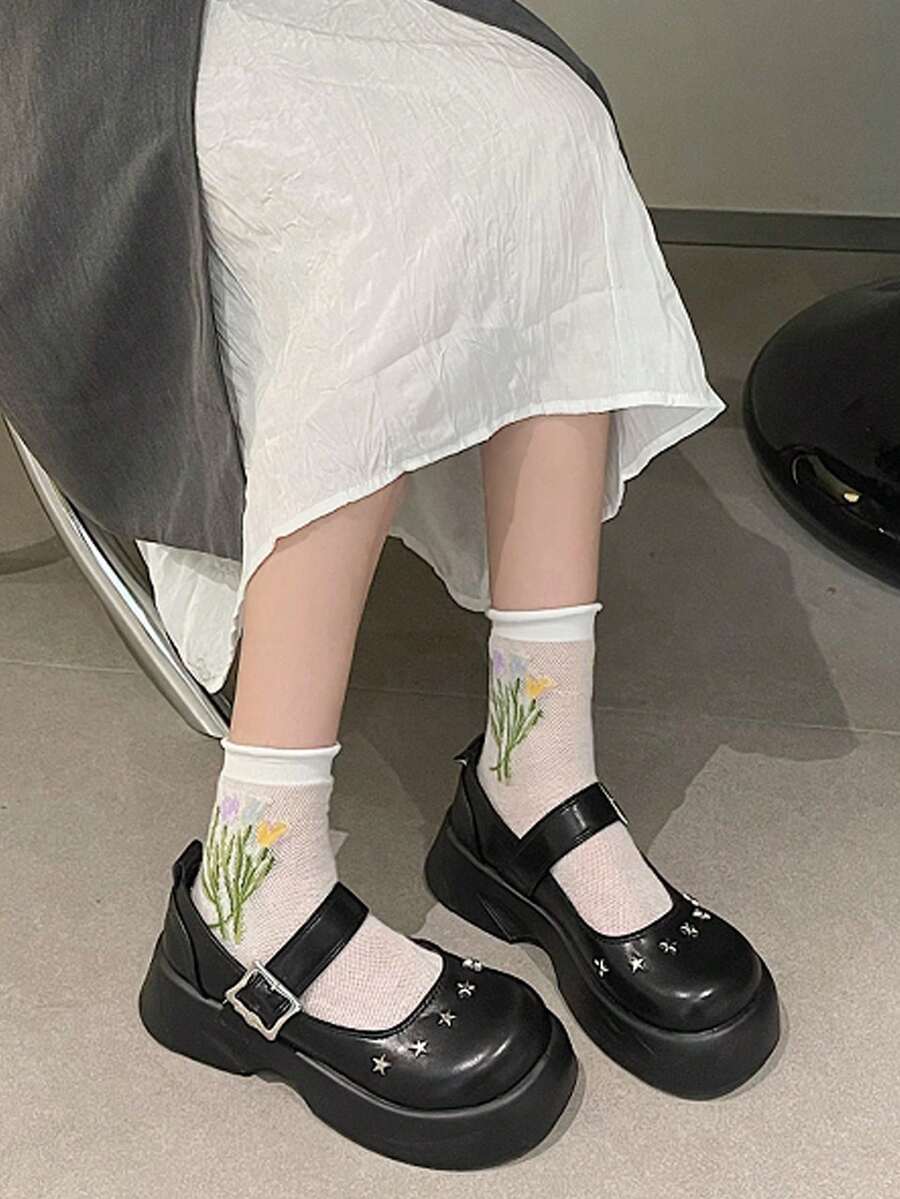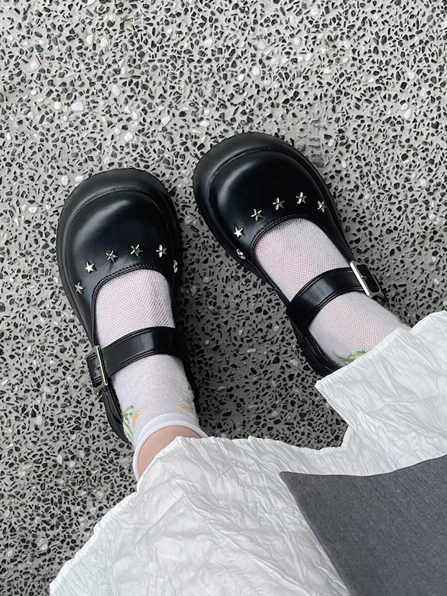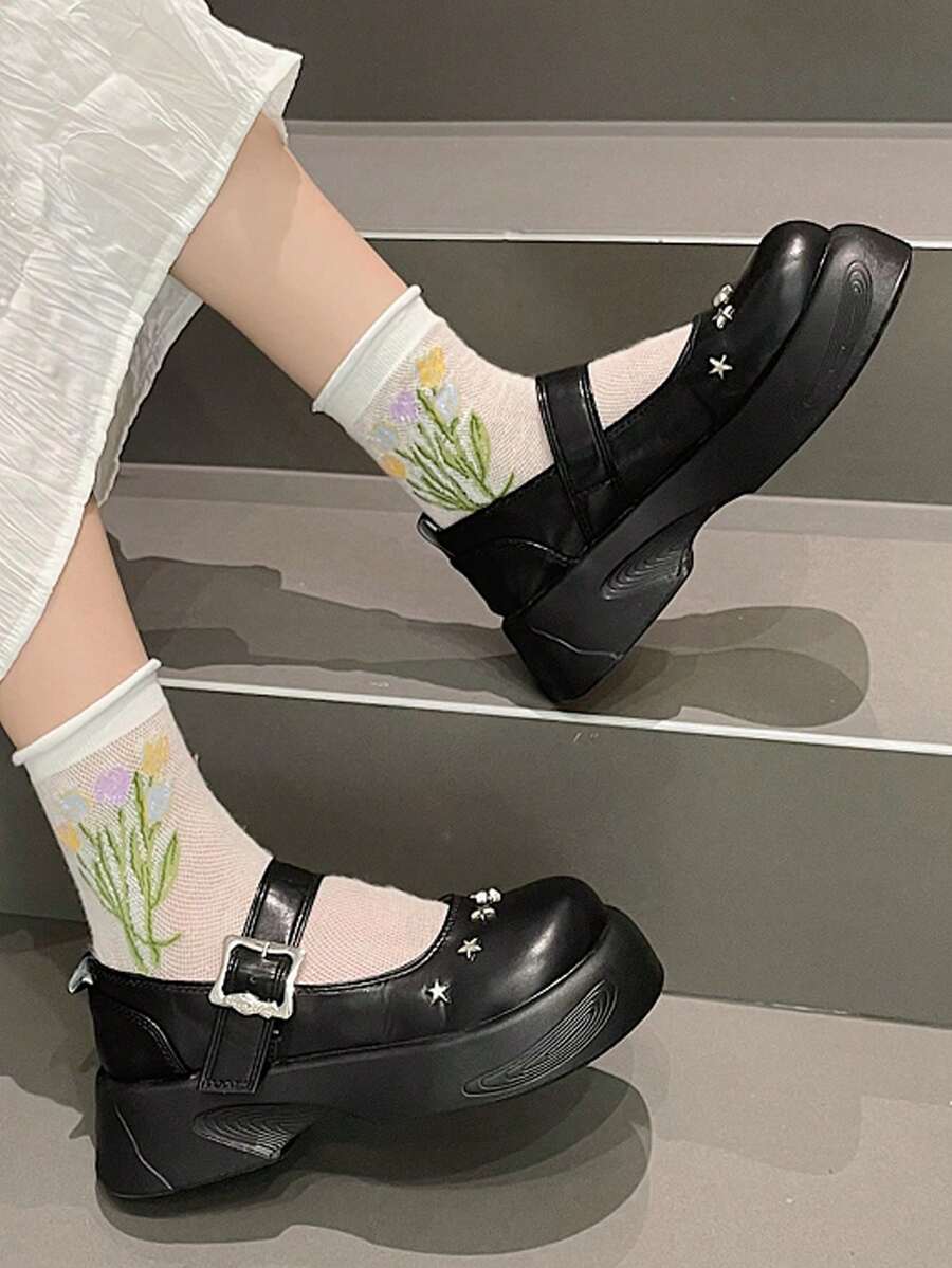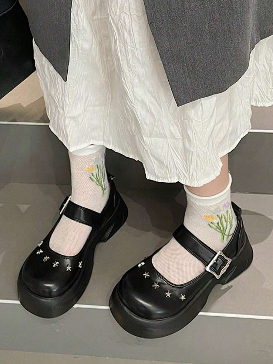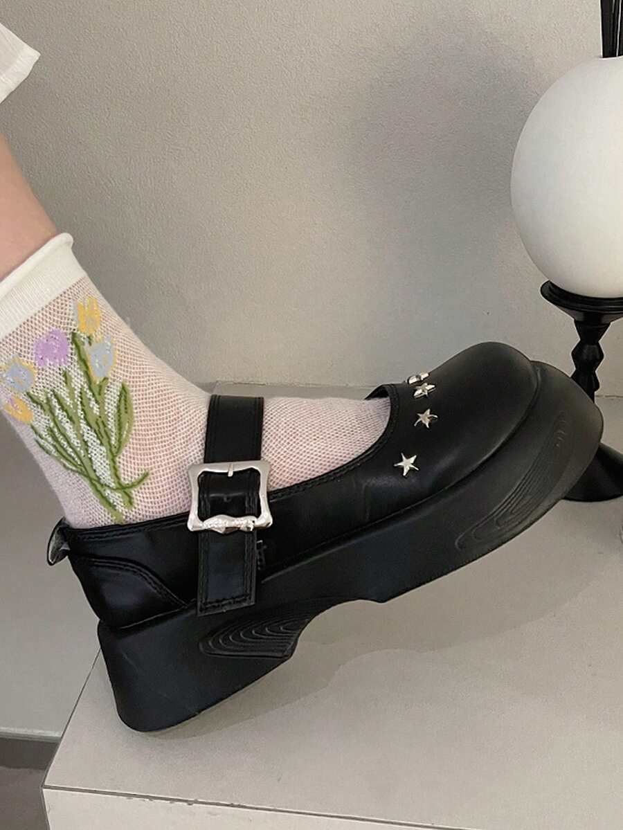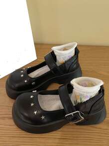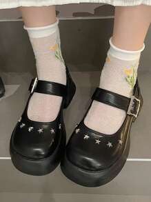 Women Buckle Decor Star Studded Flatform Mary Jane Shoes, Preppy Outdoor Flatform Shoes