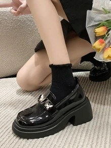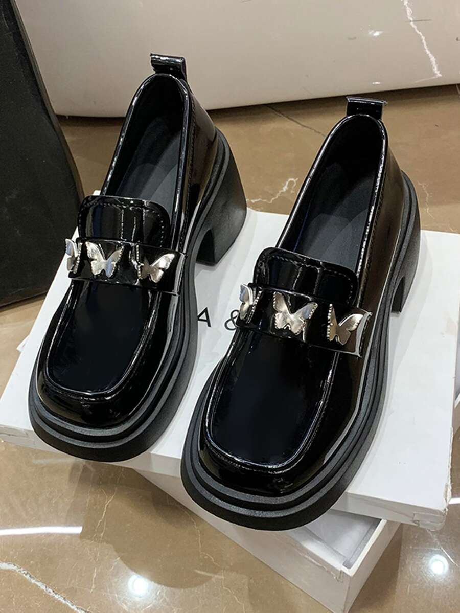 Women Butterfly Decor Flatform Shoes, Preppy Black Loafer Shoes
