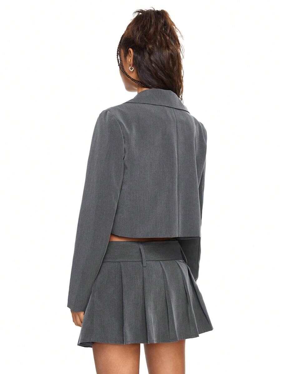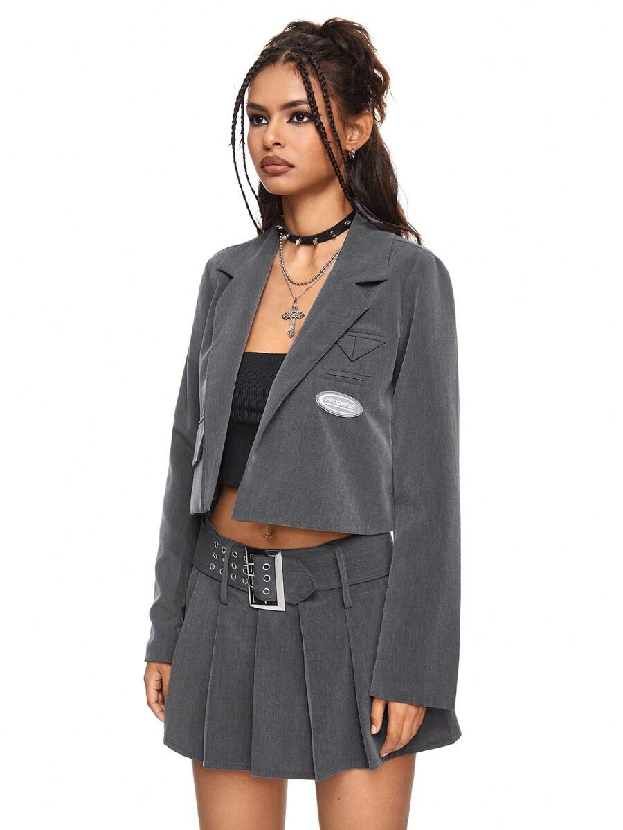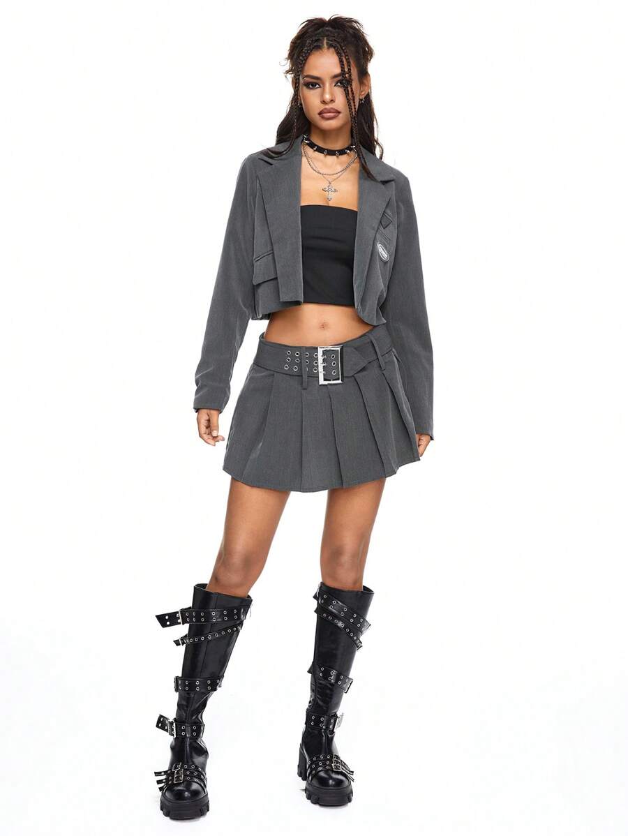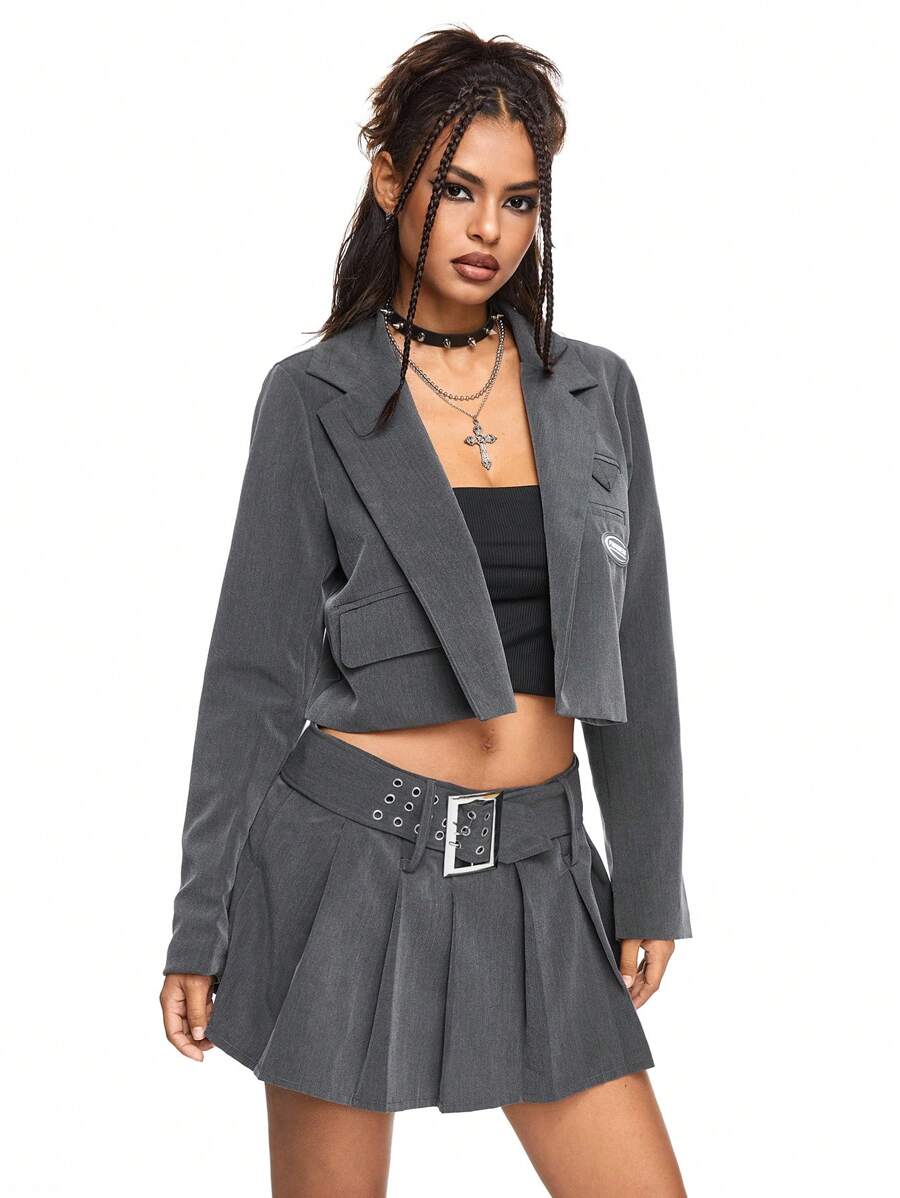 Women Cropped Blazer With Leather Label, Detachable Waist Belt, Y2K Style Mini Pleated Skirt Suit