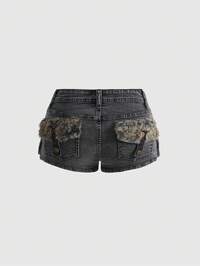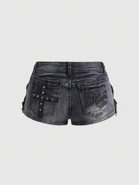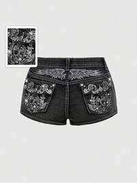 Grunge Punk Trash Punk Y2K Vintage Millennium Sexy Pocket Cross Wing Embroidery Women Fitted Denim Shorts, Women Button, Pocket, Zipper Low Waist Flare Leg Navy Blue, Spring/Autumn, Casual Daily Wear, Summer/ Summerouis /Summer Cothes,Streetwear Women's Concert Costumes, Rave Costumes, Carnival Costumes, Country Concert Costumes,Summer Outfits For Women
