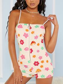 Women Floral Print Zipper Front Cami Unitard Romper