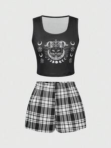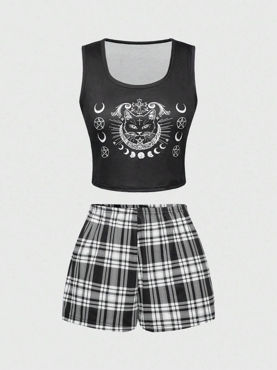 Goth Women Gothic Black Cat Floral Moon Star Cross Print Camisole And Shorts Pajama Set