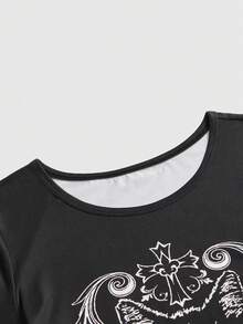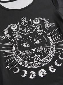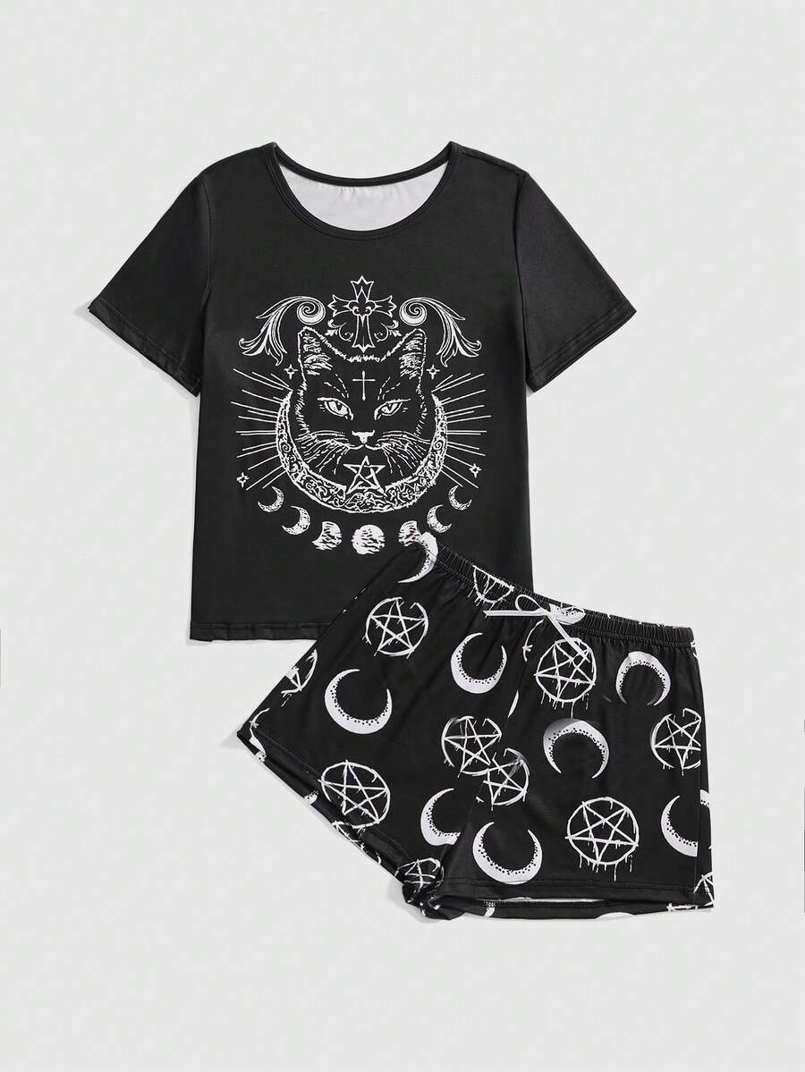 Women Gothic Black Cat Floral Moon Star Cross Print Short Sleeve Shorts Pajama Set
