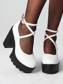 Women Gothic Punk Mary Jane Shoes, Closed Toe Cross-Strap, Chunky Heel, Strap Buckle, JK Uniform, Waterproof Platform, Formal Work Pumps, Halloween