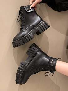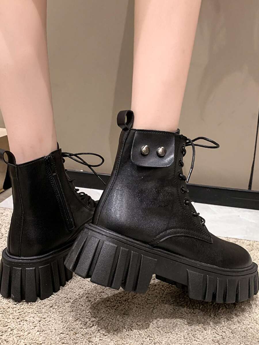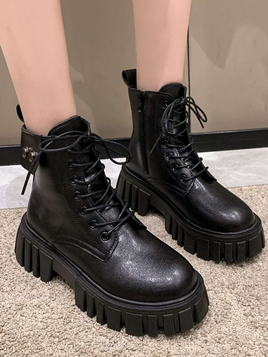 Women Lace-up Front Flatform Fashion Boots Cool Black Combat Boots