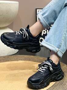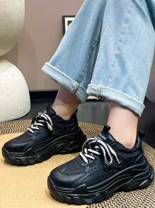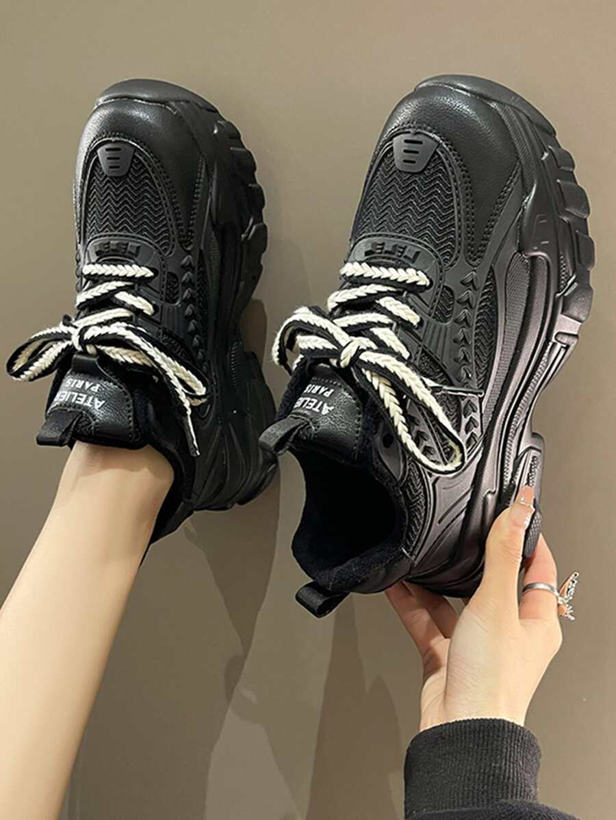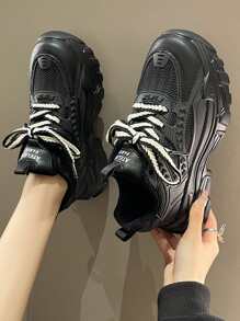 Women Letter Detail Lace-up Front Sports Shoes, Sporty Black Chunky Sneakers