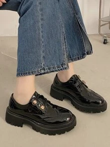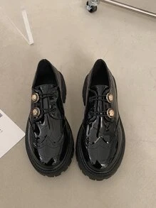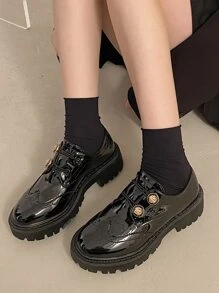 Anime Women Metal Decor Loafers, Preppy Flatform Shoes Black