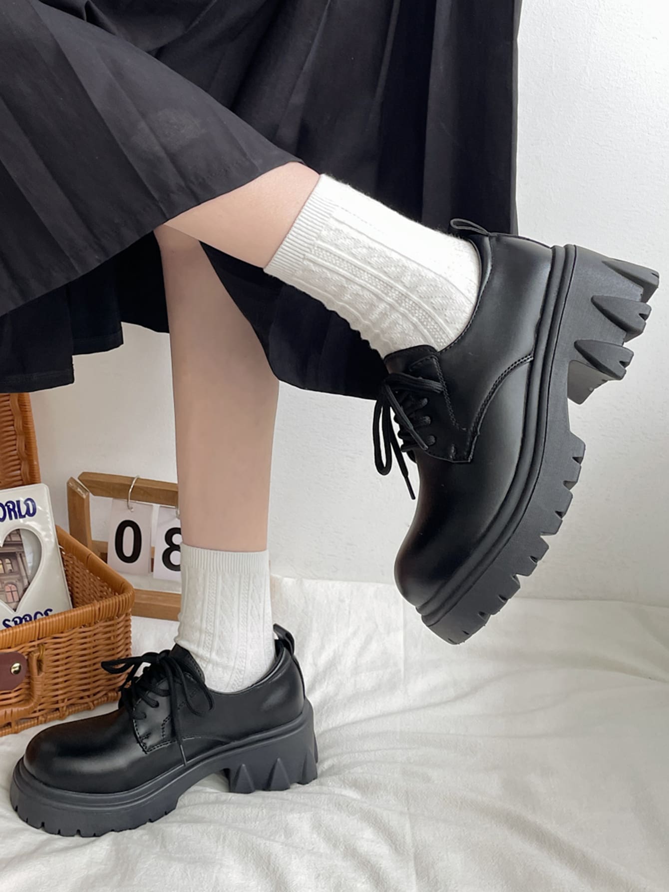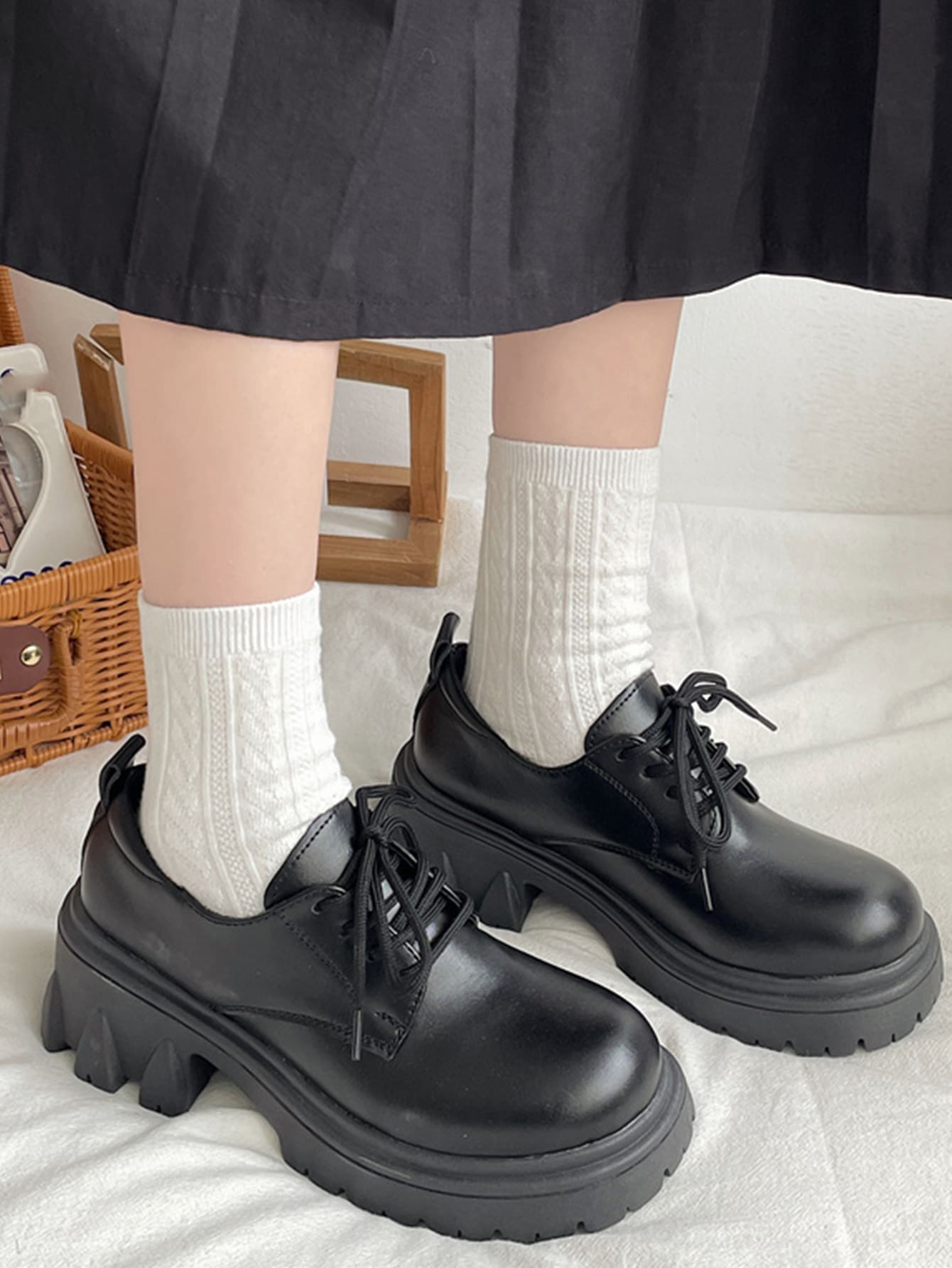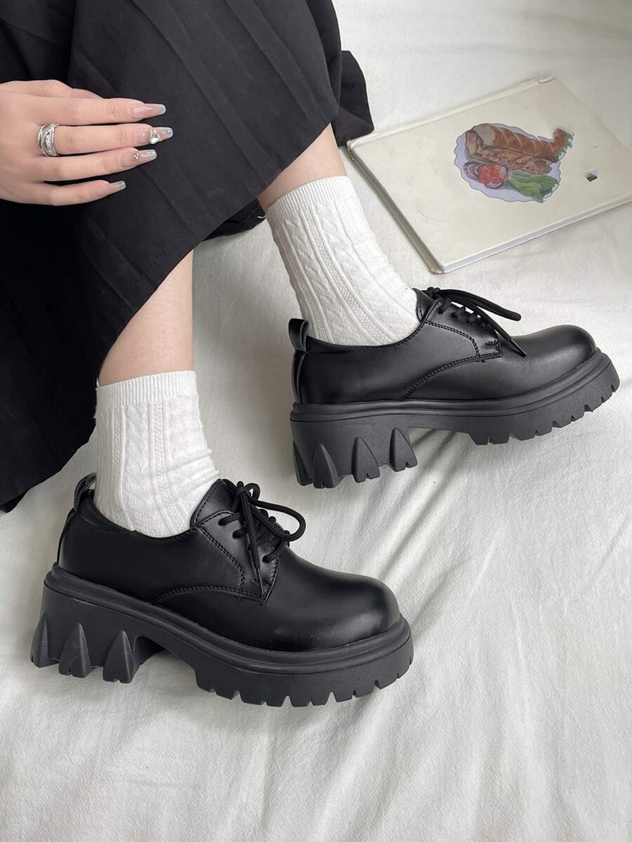 Women Round Toe Lace-up Front Platform Shoes Punk Black Oxford Shoes