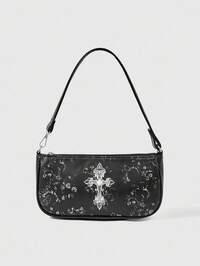 Goth Women's Vintage Gothic Cross Chain Detail Shoulder Bag With Cross Decoration,Fashionable Niche Design, Steampunk, Goth Bag For Women, Cool Street Wear, Perfect For Music Festival, Concert, Rock Style Bag For Women, School, 2000s Fashion Style Bag For Women, Halloween, Halloween Purse Perfect For Fancy Party Halloween Fashion & Gothic Fashion, Best Halloween Gifts For Women Goth Ladies, Women Shoulder Bag, Hobo Bag, Punk, Pattern Print, Gothic Style, Bowknot Decoration, Fashionable, Personalized, Simple, Versatile, Street, Sweet And Cool Girls, Hot Girls, Y2k, Teenagers, Halloween, Halloween Bags Perfect For Fancy Party Matching With Halloween Costumes