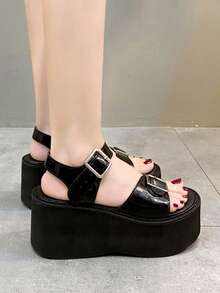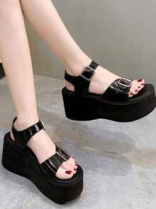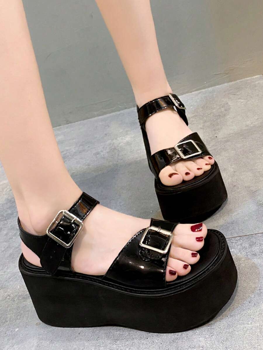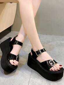 Women Solid Buckle Decor Flatform Sandals, Fashion Sandals