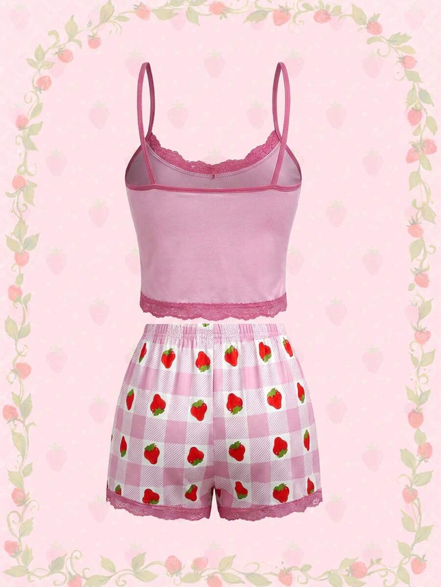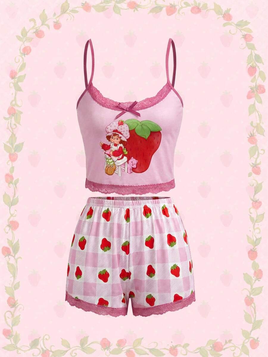 Women's Bow Decor Cartoon Print Camisole Top And Shorts Casual Sleepwear Set
