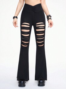 Women's Gothic Style Ripped Burnt Flower Pattern Skinny Flared Pants With Shirred Waist