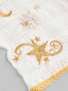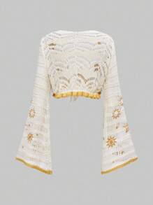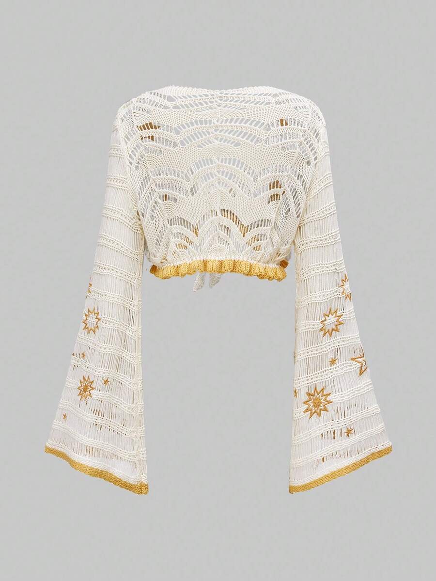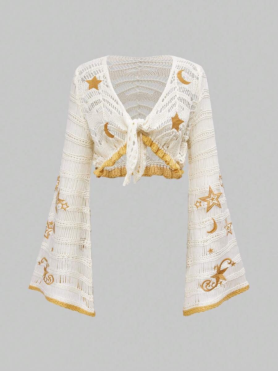 Women's Hippie Bohemian Style Moon & Star Embroidered Crochet Flare Sleeve Cardigan