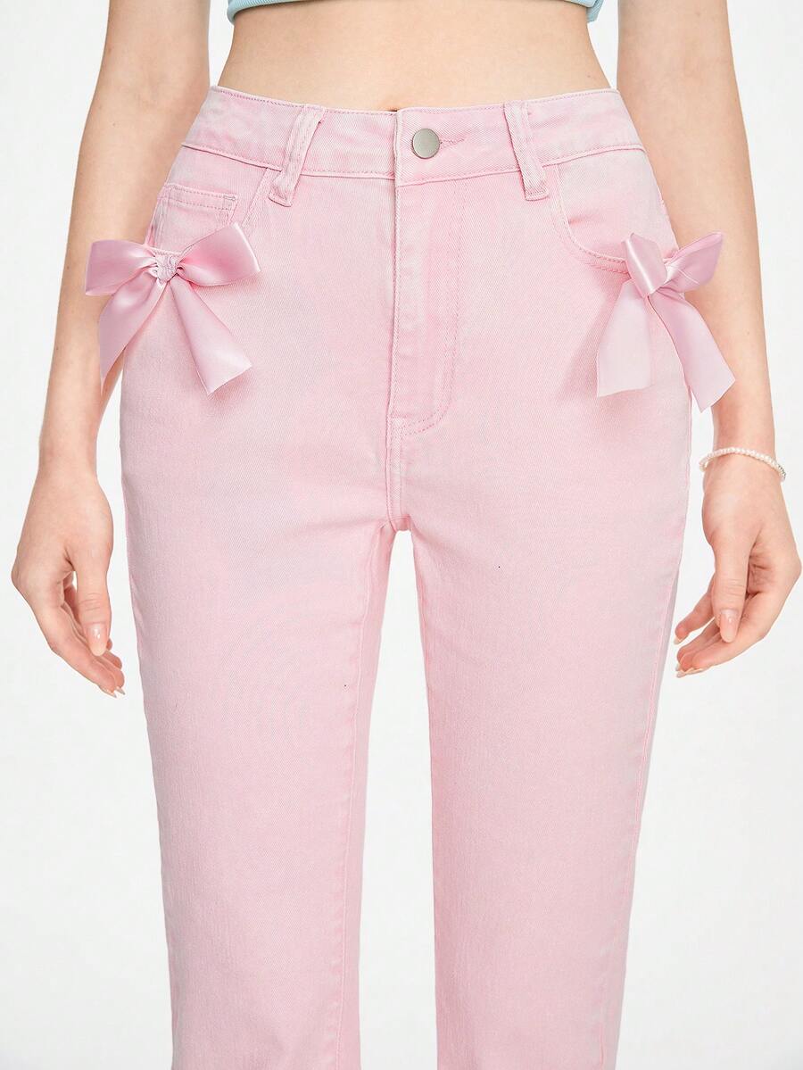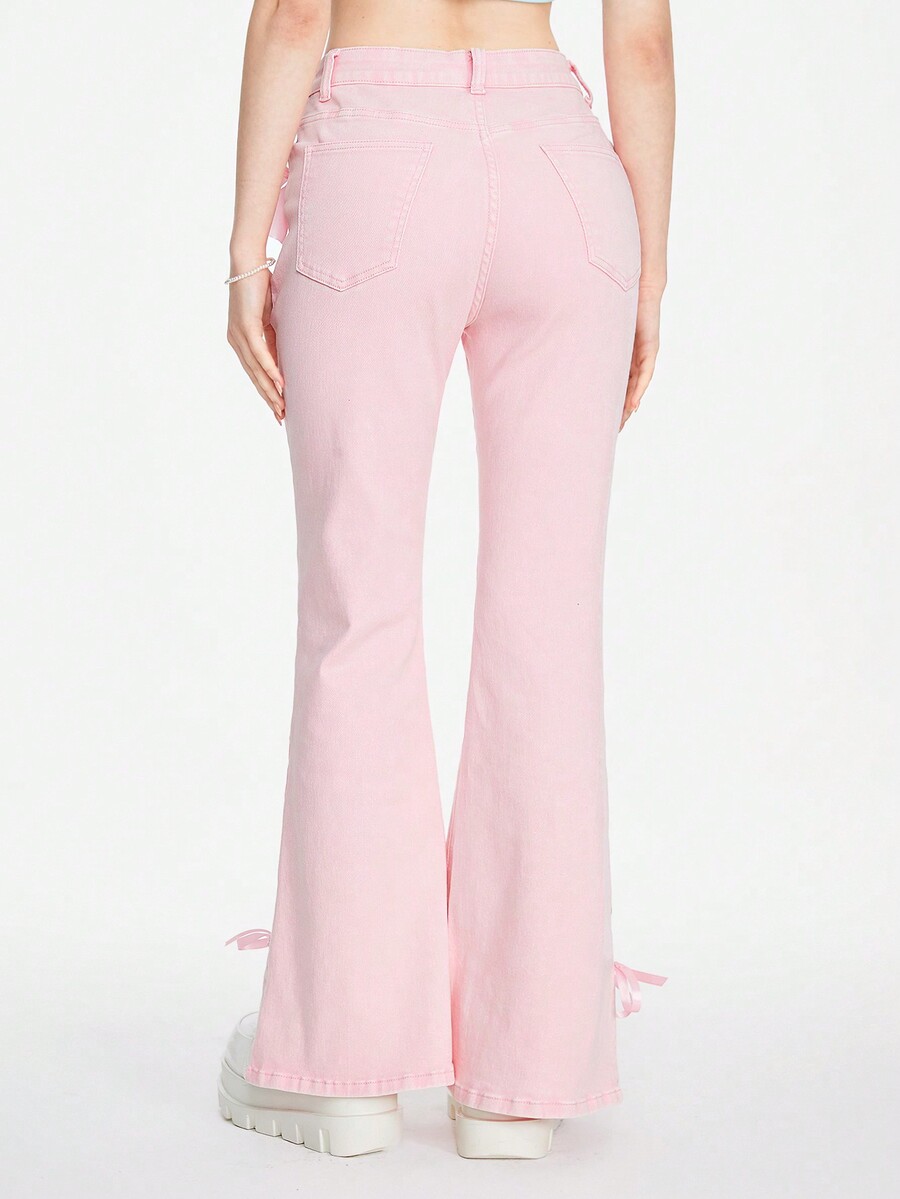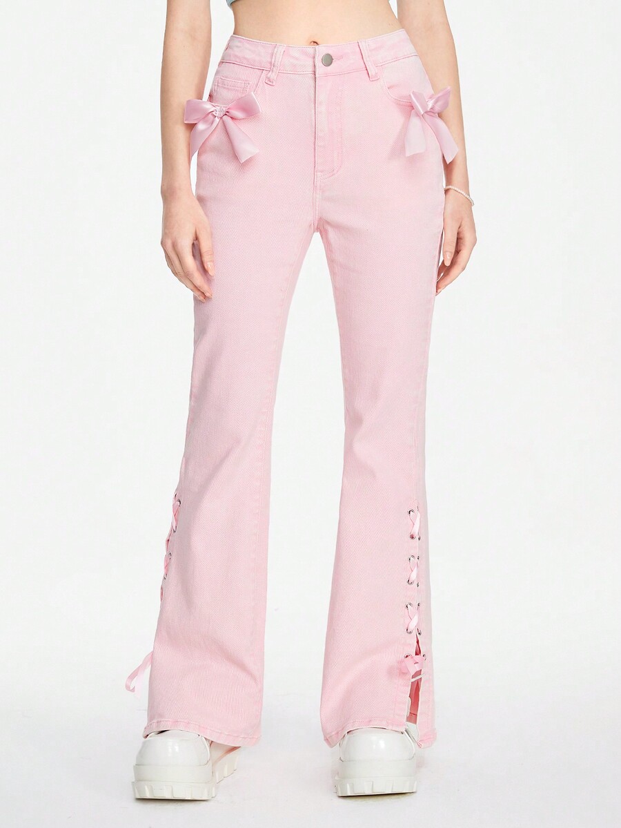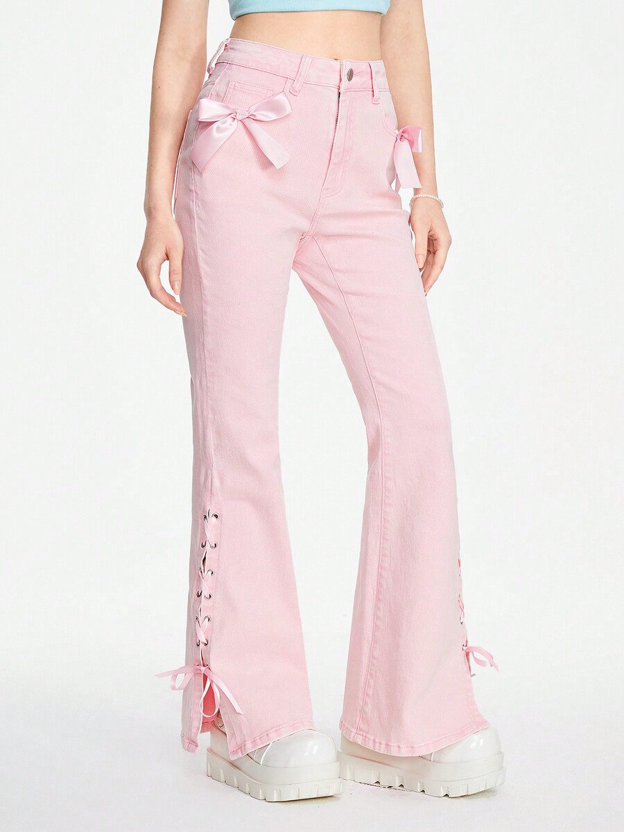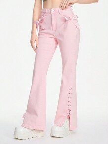 Women's Kawaii Girl Style Flare Jeans With Ribbon Tie & 3D Bowknot Decoration
