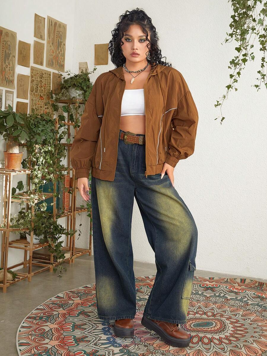 Women's Plus Size Zipper Front Hooded Jacket With Drawstring